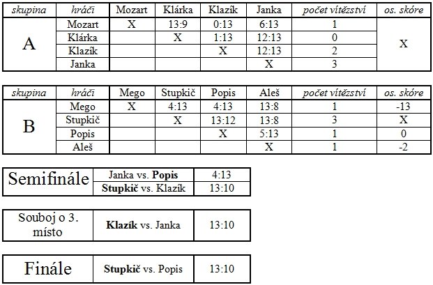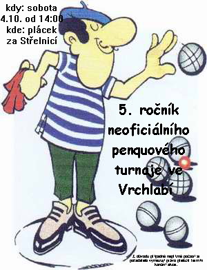 7. ROČNÍK NEOFICIÁLNÍHO PETANGOVÉHO TURNAJE VE VRCHLABÍ - 2010Již po sedmé se letos vrchlabský hráčům v petanque podařilo změřit síly v tradičním podzimním turnaji. Avizované místo utkání bylo operativně přesunuto na plácek za restaurací Sklípek. Zdejší štěrk i absence zaparkovaných automobilů vyhovoval mnohem více než plácek za KD Střelnice. Sluníčko nám svítilo, pivko chutnalo a tak se mohlo začít hrát.Pro letošní ročník byla charakteristická absence řady favoritů a tomu odpovídalo i větší množství startujících nováčků (někteří z nich drželi v ruce koule poprvé). Přesto měl dát právě tento turnaj odpověď, jestli dá světu prvního držitele zlatého hattricku tohoto turnaje. Ve skupině A se ocitli Stoupa, Popis, Anička a Vendulka. Do semifinálových bojů ji opouštěl Stoupa s třemi skalpy svých soupeřů a Popis se dvěma. Skupina B se ukázala být v postupové matematice o něco zajímavější, neboť zde se o druhém postupujícím rozhodlo až na základě srovnání osobního skóre a byla jím Blanka. Jako první postupoval Klazik. Ze semifinálových soubojů postoupili do finále Stoupa a Klazik. Ze všech Klazikových soupeřů z tohoto dne dokázal Stoupa vzdorovat nejdéle, ovšem ani to nestačilo, a tak se po třetí v řadě stal petanquovým šampiónem Klazik.